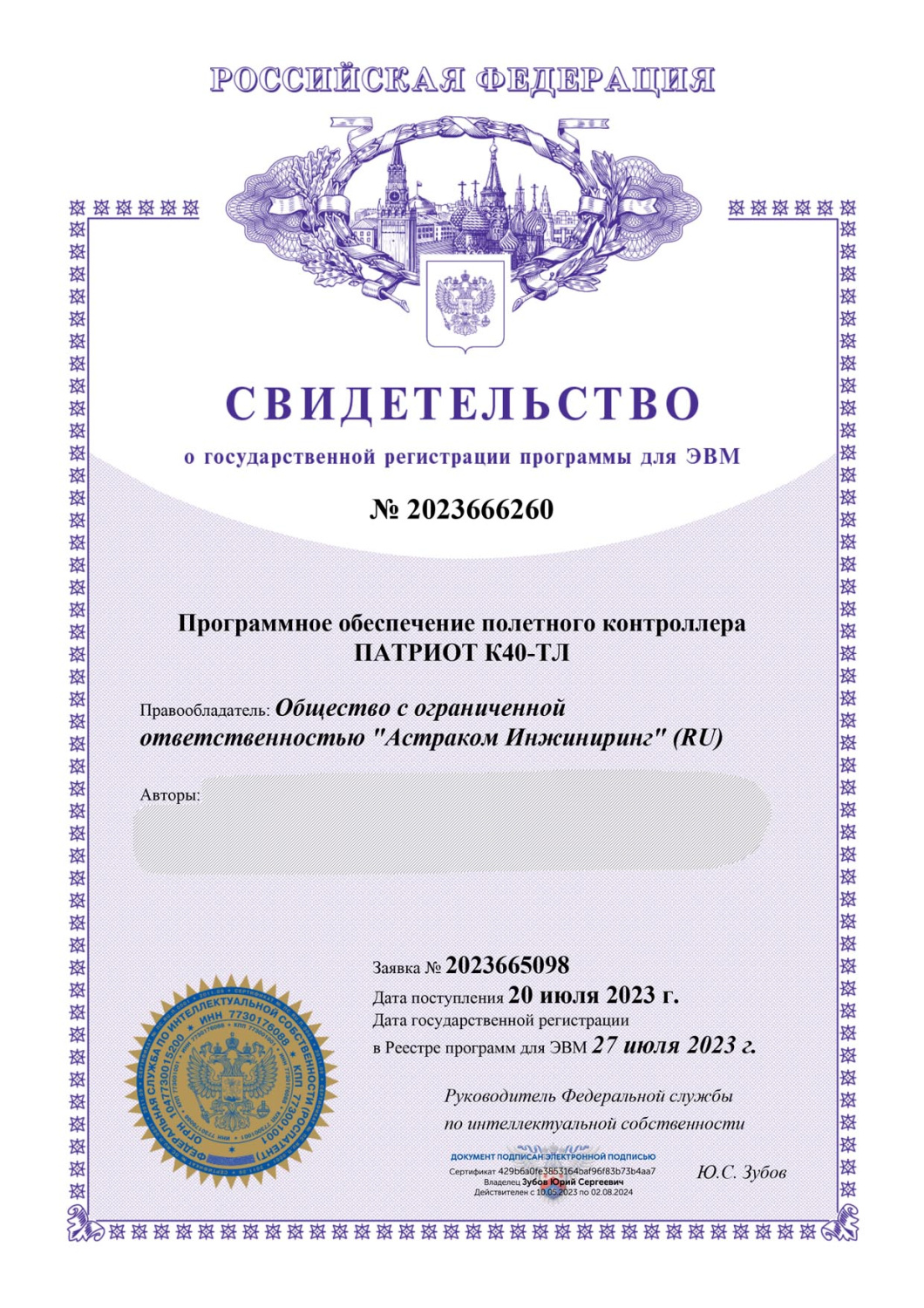 Свидетельство о государственной регистрации программного обеспечения полетного контроллера беспилотного летательного аппарата ПАТРИОТ К40-ТЛ