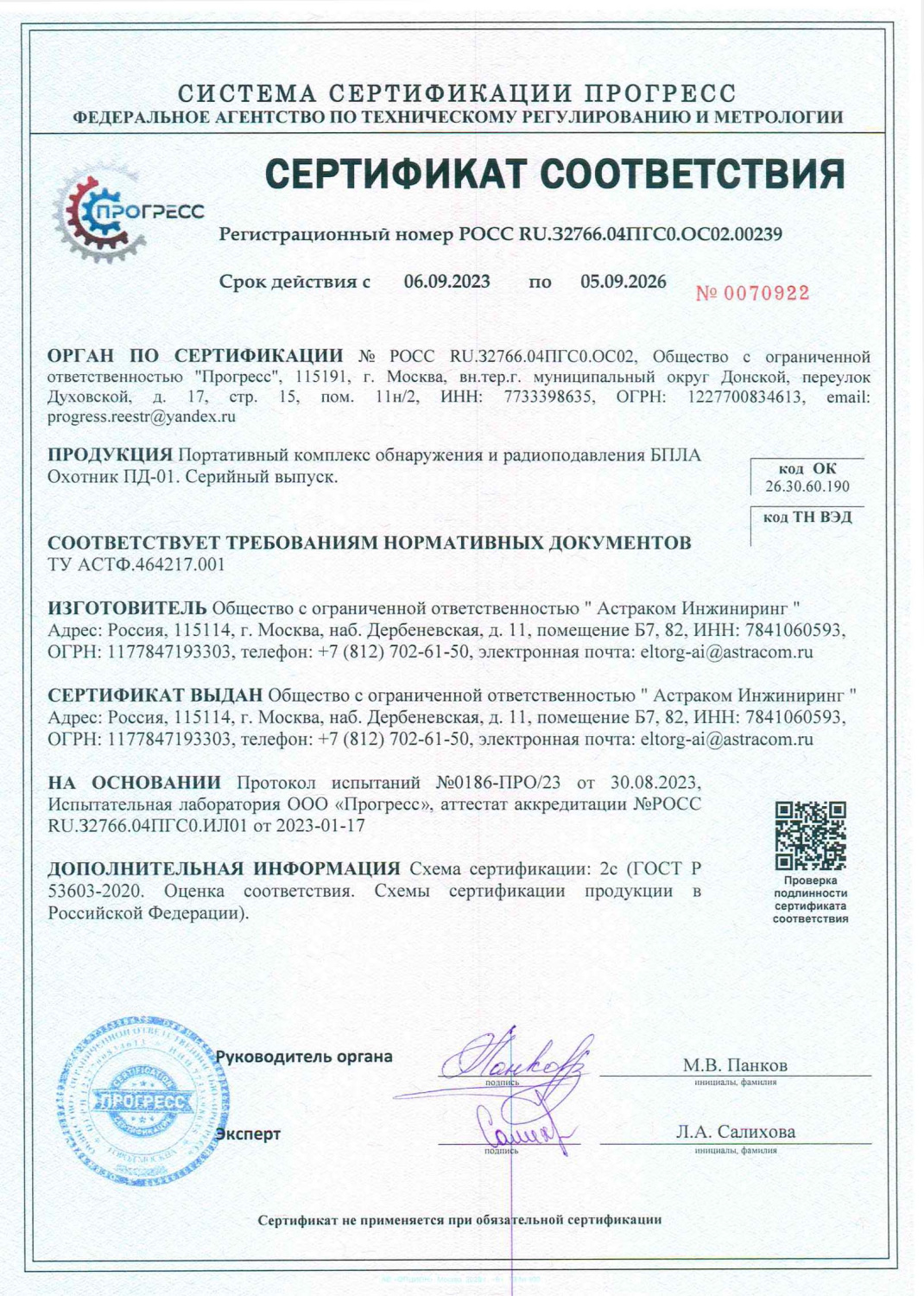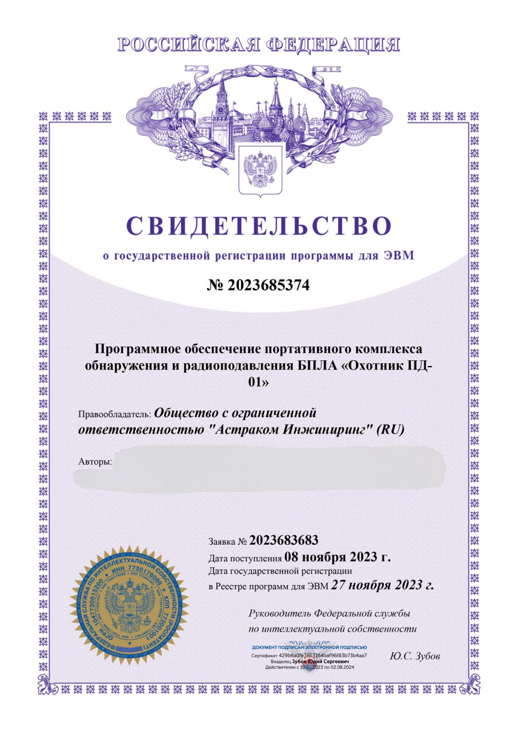 Свидетельство о государственной регистрации программного обеспечения портативного комплекса обнаружения и радиоподавления БПЛА "Охотник ПД-01"