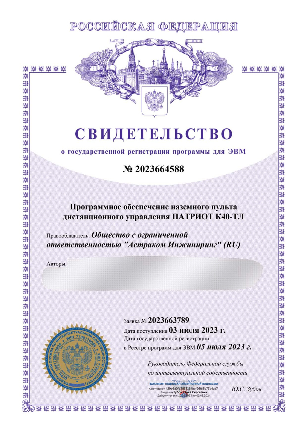 Свидетельство о государственной регистрации программного обеспечения наземного пульта дистанционного управления беспилотного летательного аппарата ПАТРИОТ К40-ТЛ