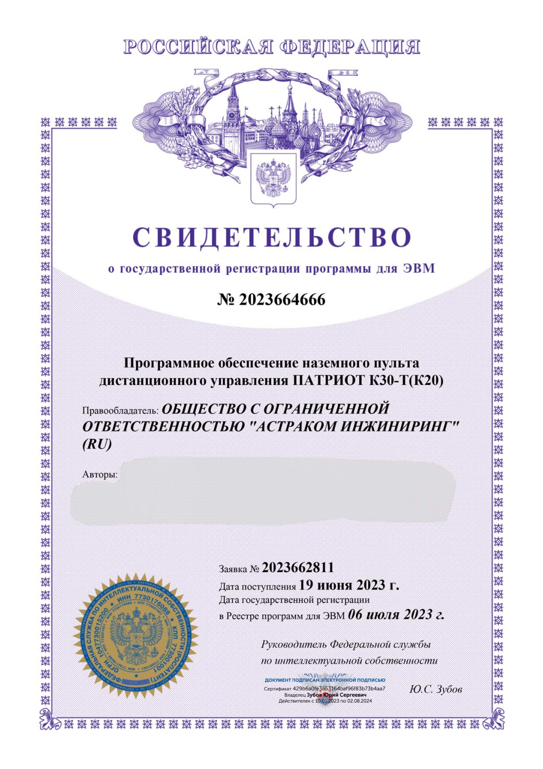 Свидетельство о государственной регистрации программного обеспечения наземного пульта дистанционного управления беспилотного летательного аппарата ПАТРИОТ К30 и К20