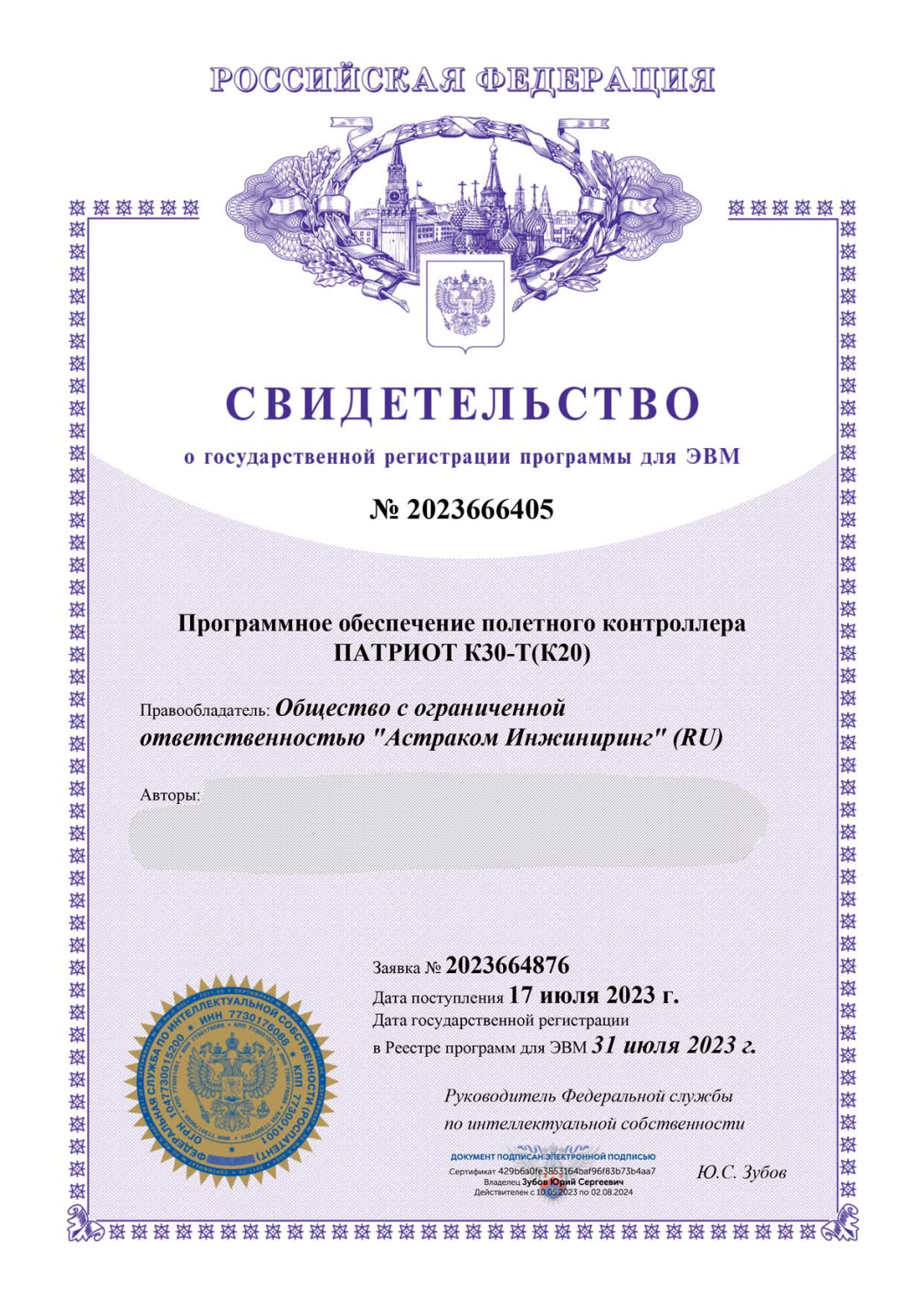 Свидетельство о государственной регистрации программного обеспечения полетного контроллера беспилотного летательного аппарата ПАТРИОТ К30 и К20